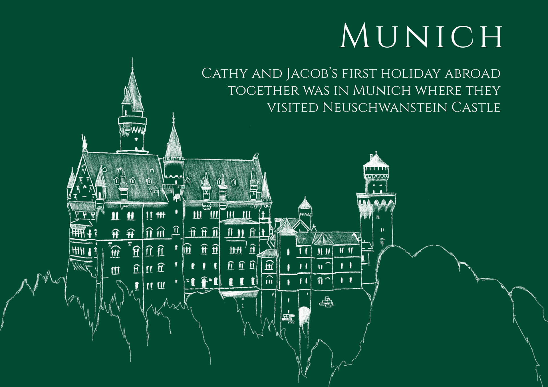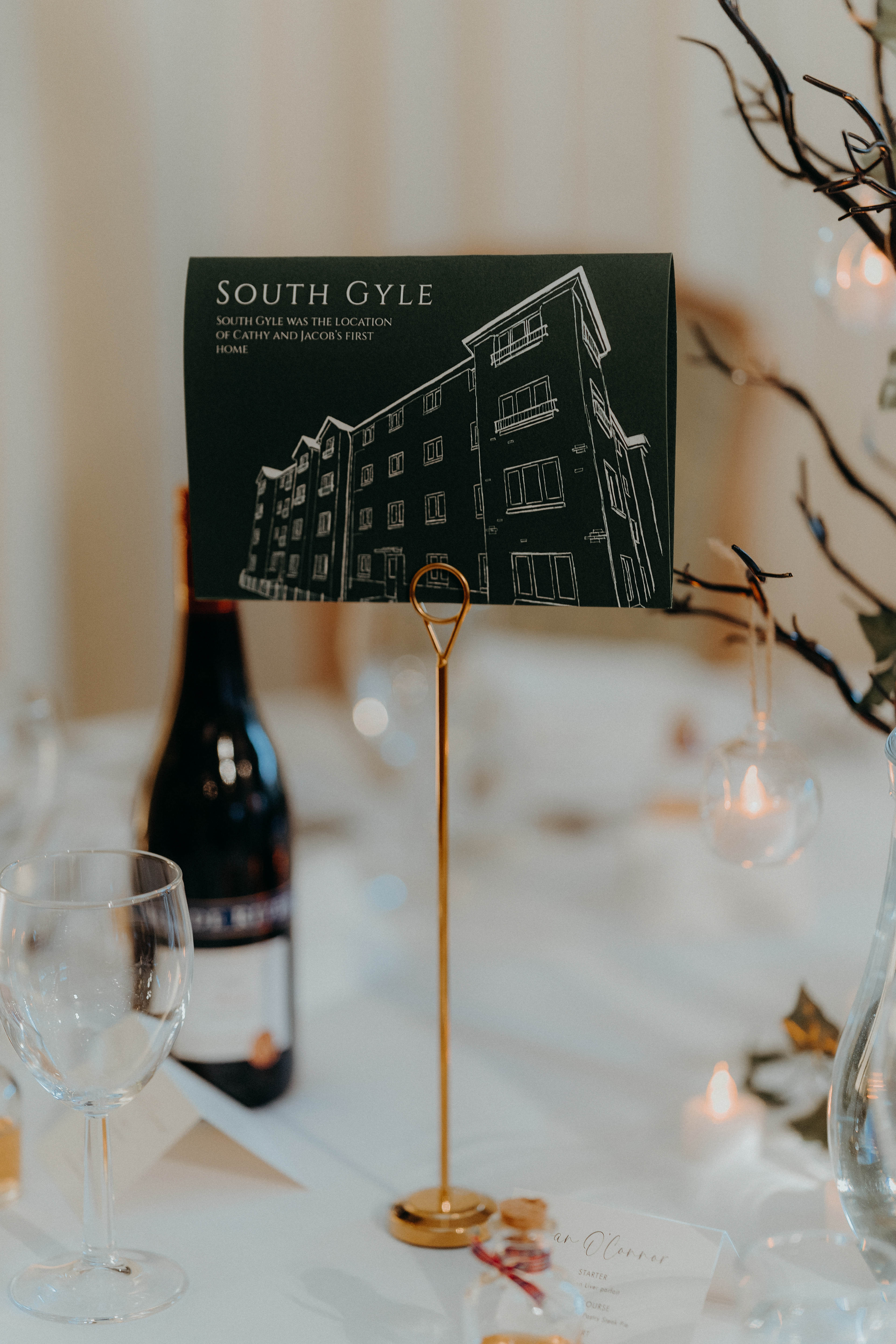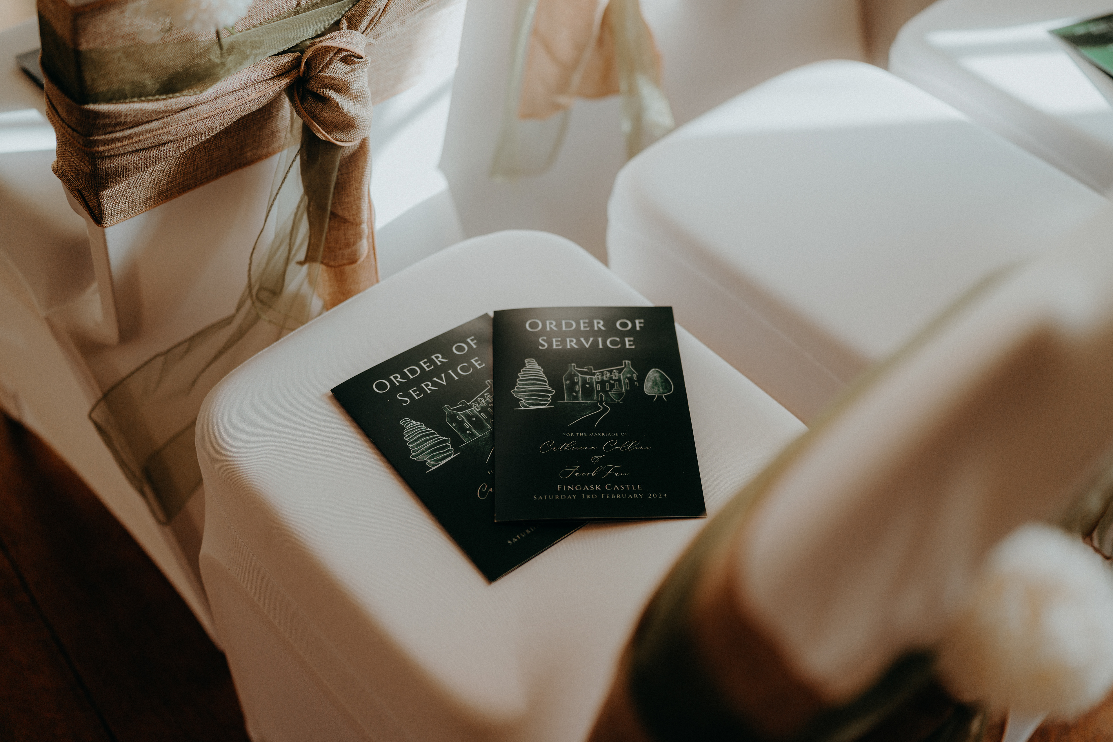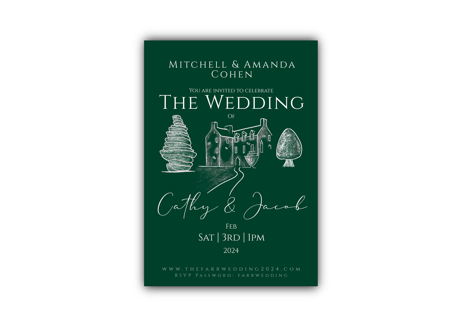 I created an illustration of the wedding venue and used it as the logo across various designs. The winter wedding scene was encapsulated with a dark green winter colour scheme.